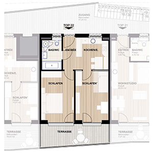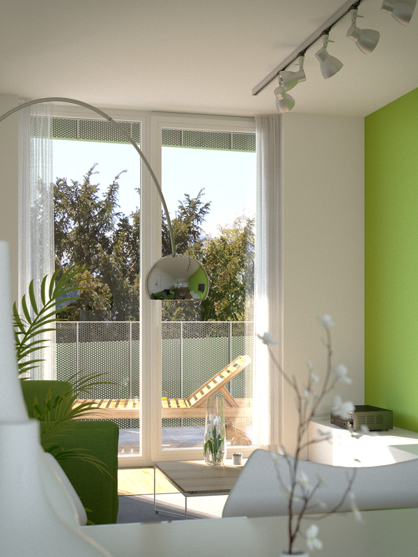 Aufgrund der beidseitigen Aussenwände können alle Räume natürlich belichtet werden. Ausserdem verfügen sämtliche Wohnungen über private Terrassenflächen über die gesamte Westseite.