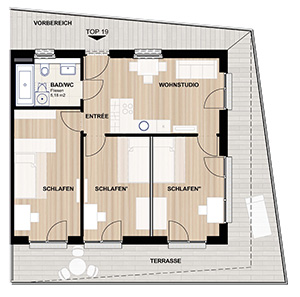 Aufgrund der dreiseitigen Aussenwände können alle Räume natürlich belichtet werden. Ausserdem verfügen auch sämtliche Wohnungen über private Terrassenflächen an der Ost-, West- und Südseite.