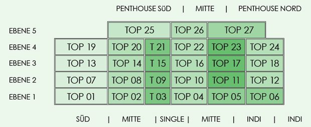Je nach Ausrichtung, Größe und Ebene haben sich unterschiedlich gestaltete Wohnungen herausgebildet. Insgesamt weist SILVA, verteilt über fünf Wohnebenen, sieben Grundriss-Typen auf. Aufgrund der Abtreppung des Geländes und der einmaligen Gebäudegeometrie hat wiederum jeder dieser Typen seine Besonderheiten. Ein extra Garten, erweiterte Wohnfläche, mehr Terrassenfläche ... da ist sicher für jeden etwas dabei:
